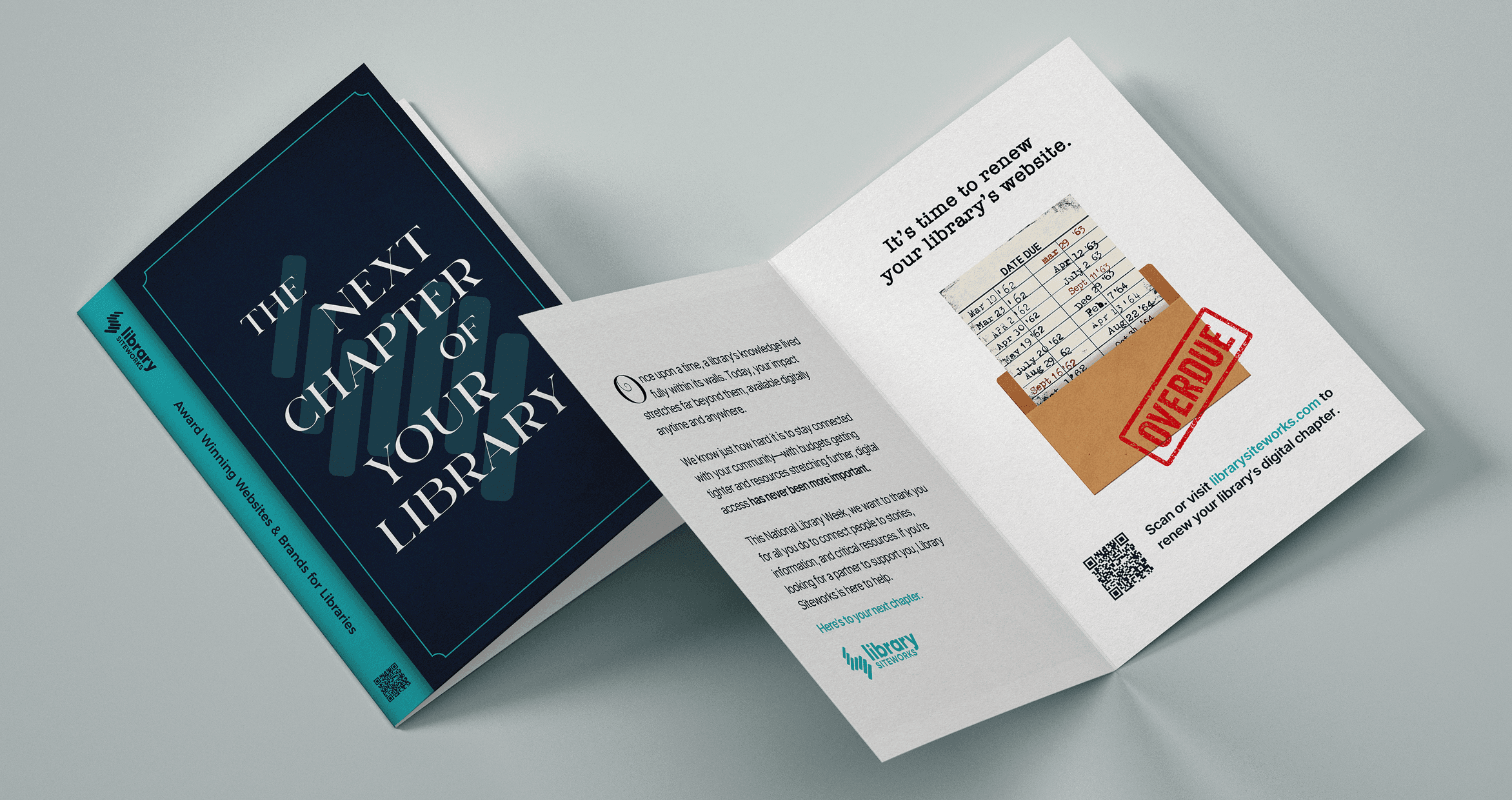 We mailed libraries a book-style card with an overdue slip and a custom sticker sheet as a lighthearted reminder that their digital presence may be due for a refresh.